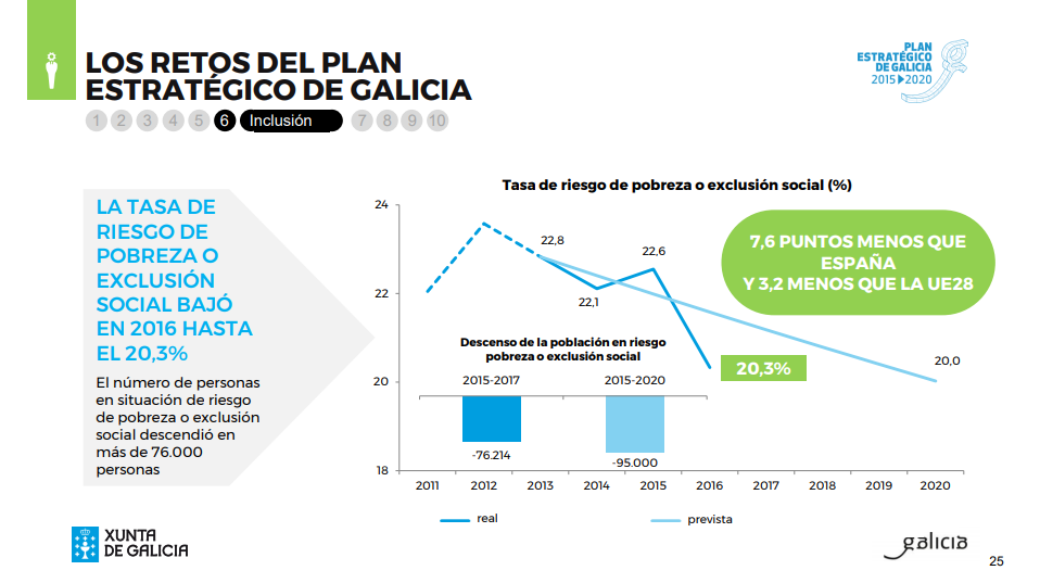 Moitas das metas dos ODS xa foron avanzadas no Plan Estratéxico Galicia ( PEG) 2015-2020 , constituíndo eidos de traballo en marcha para a Xunta de Galicia. Entre elas destaca especialmente a de “Promover a inclusión social e loitar contra a pobreza e calquera forma de discriminación”