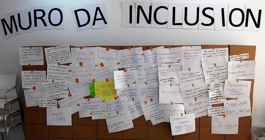 Na mesma xornada respostouse á pregunta Como lle facemos fronte as mentiras e qué propostas teño? Con todas elas construíuse o Muro da Inclusión. Ambos muros están feitos do xeito mais sinxelo posible, neste caso con caixas de cartón como as que veñen de utilizar para durmir varias das persoas que asistiron.